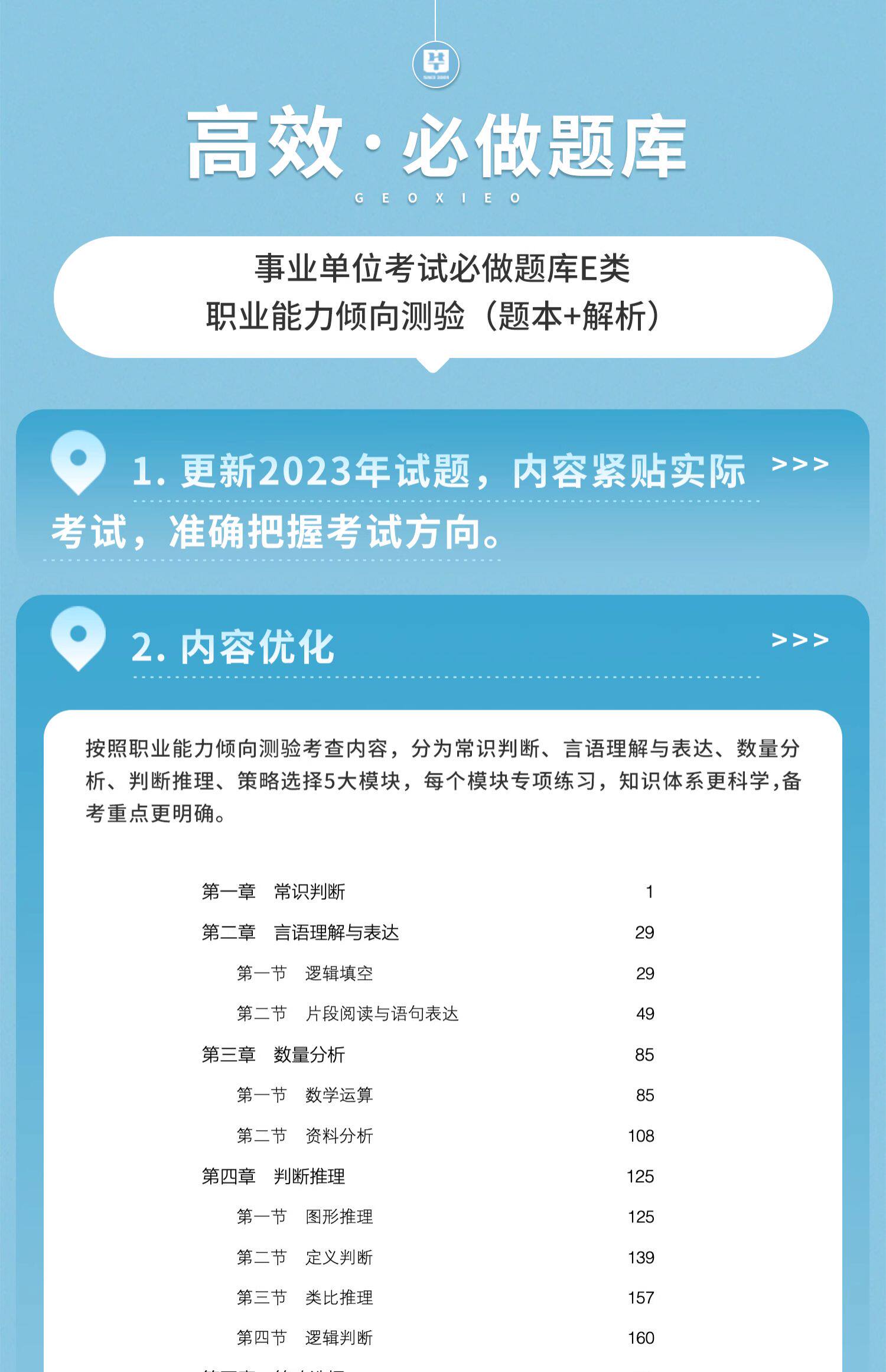 【华图图书网】为您提供2024版事业单位公开招聘分类考试专用教材职业能力倾向测验必做题库E类(2本套),更多最新全国通用事业单位图书考试网校课程及视频请关注华图图书网!